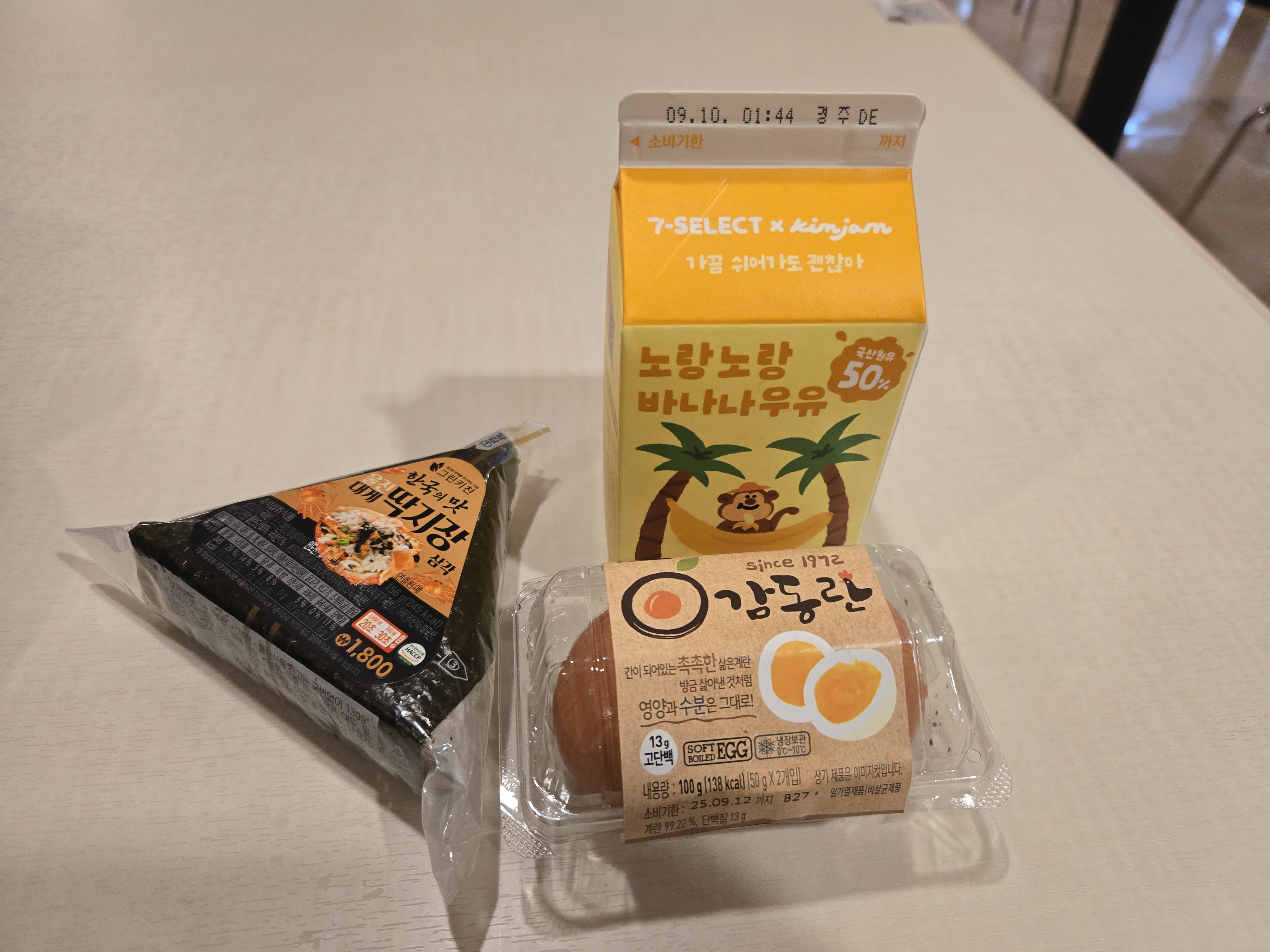터미널 2층 편의점에서 구매한 삼각김밥+반숙란+빠유가 되겠습니다.